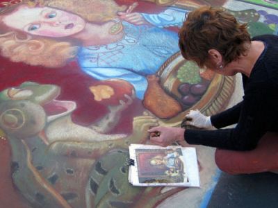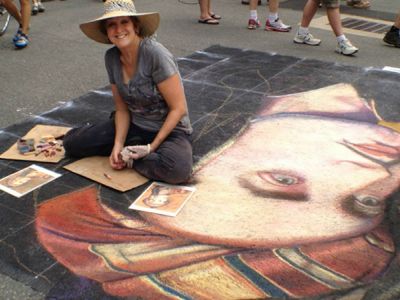 As a graphic designer, Jeanie’s profession requires accommodating her clients’ needs and tastes. As a chalk artist, she enjoys the freedom of choosing and art directing her own subject matter – most often portraits – and bringing that image to completion on a grand scale.